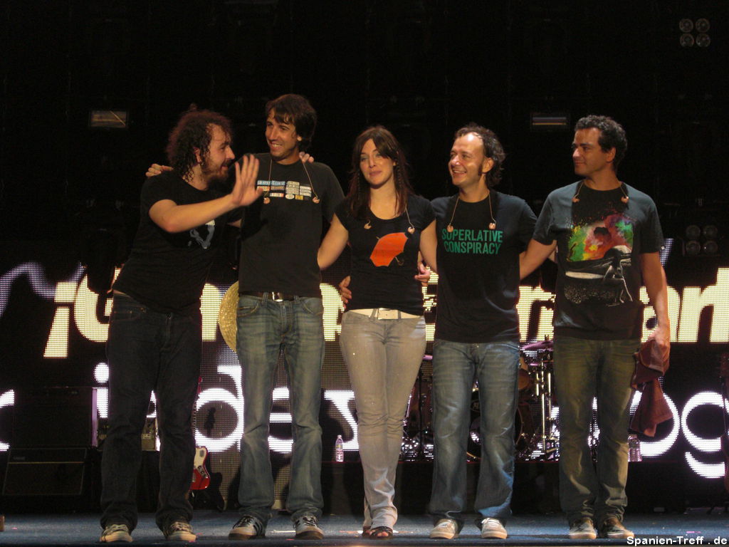 Die spanische Popband La Oreja de Van Gogh, beim Live-Konzert in Benicaró. Sängerin Leire Martínez Ochoa, zusammen mit dem Gitarristen Pablo Benegas Urabayen, dem Bassisten Álvaro Fuentes Ibarz, Schlagzeuger Haritz Garde Fernández und dem Keyboarder Xabi San Martín Beldarrain.