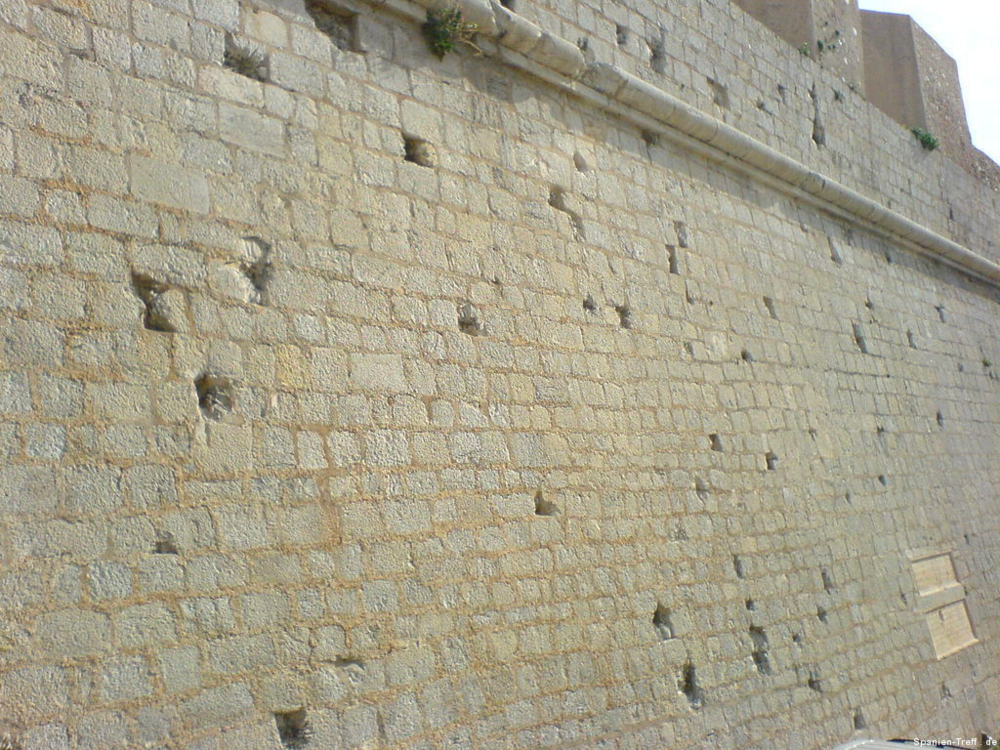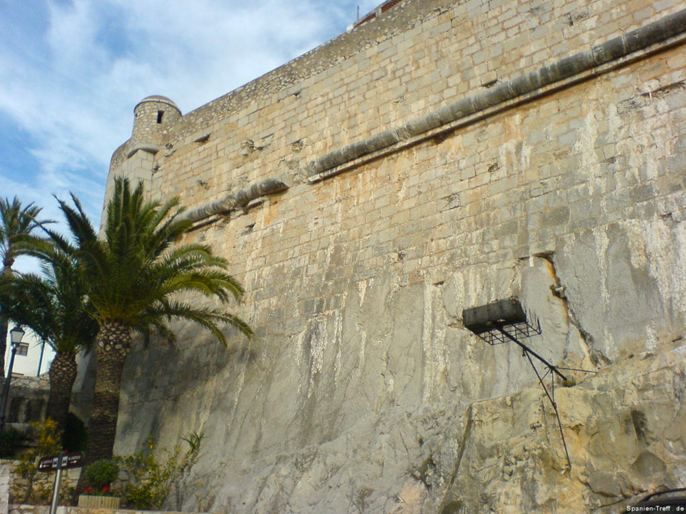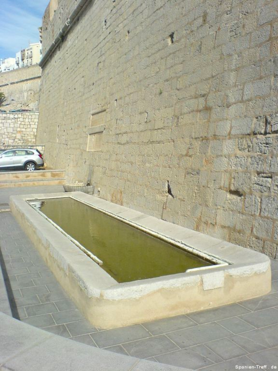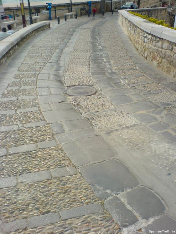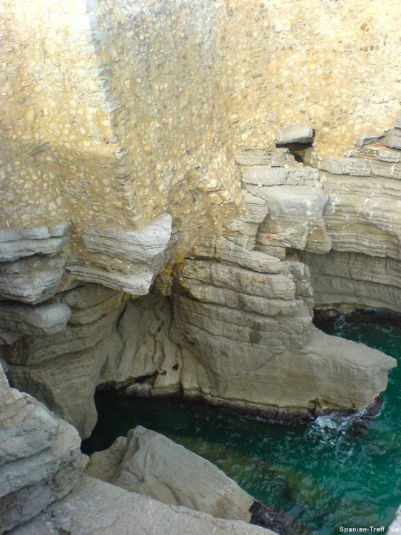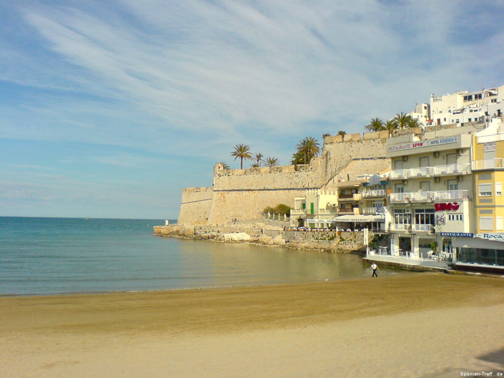 Peñíscola liegt knapp sieben Kilometer Südlich von Benicarló und ist ein beliebtes Ausflugsziel. Hier möchte ich euch auf einen kleine Rundgang durch Peñíscola mitnehmen. Über die Burg von Peñiscola hatte ich schon einmal berichtet, aber nun nehme ich euch mit zu einem Rundgang auf den Felsen und ein wenig um die Burg herum. Wenn man sich der Stadt nähert, erkennt man sofort, dass es sich um eine Halbinsel handelt, bzw einem Fels in unmittelbare Strandnähe, den die Menschen in eine Stadt verwandelt haben. Vom Norden her kann man sich dem langen Strand von Benicaró aus nähern. Der Fels und die Altstadt von Peñíscola darauf, ist sofort zu sehen. Peñíscola vom Strand aus Peñíscola und Strand Ein moderner Brunnen ziert den neuen Platz am Strand von Peñiscola, welcher zugleich auf Tiefgarage ist. Die im zweiten Bild hinter dem Brunen zu sehende Eisdiele von Häagen-Dazs ist dort leider nicht mehr zu finden, obwohl sie dort Jahrelang war. Moderner Brunnen vor Peñíscola Moderner Brunnen vor Peñíscola Das schöne daran, wenn man derartige Orte auch mal außerhalb der Touristischen Hochzeit besucht, ist das Fehlen von eben dieser Touristn. Dies machen sich auch die alten Leute zu nutzen und können in ruhe beim Touristenzentrum sitzen. Tourismus Information von Peñíscola Im Sommer drängen sich hier Körper an Körper im Strand. Man möchte da fast kaum glauben, dass darunter so viel Sand zu sehen ist. An diesem wurde, wie auch in der Stadt selbst, ein Teil des Historienfilms El Cid gedreht, bei dem 1961 Charlton Heston und Sophia Loren die Hautprollen spielten. Von einigen der Älteren dort weiß ich, wie sie sich an die damaligen Dreharbeiten in ihrer Jugend erinnern können. also bitte nicht vergessen, dort wurde einer der großen Historienfilme, aus der guten alten Hollywood Zeit gedreht. Blick vom Strand von Peñíscola in Richtung Benicarló Strand von Peñíscola und Blick aufs Meer Strand und Stadtmauern von Peñíscola Kommt man über die Straße am Strand in die Stadt befindet man sich auf dem Hauptplatz (plaza) und sieht die beeindruckende Stadtmauer, welche zahlreichen Belagerungen Stand gehalten haben. Stadtmauer von Peñíscola Die Böden sind dort mit Steinen verziert, was zum einen das Gehen etwas holpbrich macht, irgendwie auch Halt gibt, aber mit modernen Schuhen und glatten Sohlen kann man an den glatten Steinen und den teilweise sehr steilen Auf- und Abwegen, gefährlich abschrutschen und hinfallen. Bei den älteren Steinen erkennt man sogar gut die Furchen der Räder von den Karren. Steinverzierter Boden von Peñíscola Bei all den Löchern in der Stadtmauer, habe ich mich immer gefragt, ob da nur einzelne Steine sich heraus gelösst haben oder ob es doch Spuren aus all den Belagerungen der Vergangenheit sind und der unzähligen Steinschleuder und Kanonenkugel-Einschläge? Stadtmauer von Peñíscola Wir gehen aber nicht hier direkt rein, sondern nehmen den Eingang, sozusagen über die andere Meeresseite, wo der Hafen ist. Dort erkennt man auch gleich am Fuße der Stadtmauer, das große Waschbecken. Blick zum Hafen von Peñíscola und Waschbecken Hier sieht man einmal genauer das Waschbecken aus Stein, an dem die Frauen früher die Wäsche wuschen. Auch sieht man im Hintergrund noch einen kleines Becken aus Stein in der Mauer. Stein-Waschbecken von Peñíscola Nun kommen wir zum Stadttor der Stadt und gehen hier diesen Weg hoch. Stadttor von Peñíscola Der großen Straße merkt man ihren alten Charakter an, dass sie für Pferdekutschen und Karren gemacht wurde, damit deren Räder einfach rollen und die Menschen bzw. Pferde, Maultiere und Esel, guten Tritt beim Transportieren hatten. Weg und Straße von Peñíscola In der ersten Linkskurve bekommt man etwas interessantes zu sehen und wenn es stürmt sogar richtig und ebenso zu hören. Dort befindet sich direkt an den Häusern ein Abgrund, der in den Fels hinein, hinunter zum Meer führt. dort ist also der Fels vom Meer unterspült und man kann dieses auch dort plätschern hören. Bei heftigem Wellengang umso deutlicher und vor allem kann man dann auch sehen, wie dort das Wasser empor kommt. Hausfasade in Peñíscola bei der Fontaine Häuser am Wasserschlund von Peñíscola Felsspalt und Wasserschlund von Peñíscola Am Rand erkennt man auch sehr gut, wie hier die Stadt direkt auf dem Fels erbaut wurde und wie sich in einigen Höhlen das Meer sich Zugang in das Innere des Felsen gebannt hat. Blick von der Mauer auf die Felsen und das Meer. Fels von Peñíscola Abseits der großen Straße, schlängeln sich zahlreiche kleine Wege durch die Altstadt, mal mit und mal ohne Stufen oder gar Treppen. Wenn man sich dort nicht auskennt, kann verliert man dort schnell mal die Orientierung. Immerhin bleibt einem oftmals ein Orientierungspunkt, hoch oder runter Enge Gasse von Peñíscola Enge Gasse von Peñíscola mit Blumen Auf dem teilweise breiten Mauervorsprung zum Meer hin, gedeihen so einige Pflanzen wie zum Beispiel die Kakteen im folgendem Bild. Kakteen auf Peñíscola Über das Muschelhaus hatte ich schon in einem anderen Beitrag mit Bildern berichtet. Hier nun ein paar Bilder mehr dazu, wo man sich auch ein wenig näher die Fassade, mit zahlreichen anderen Behausungen von Meeresbewohnern verziert, sehen. Muschelhaus von Peñíscola Fassade des Muschelhauses von Peñíscola Fasssade des Muschelhauses von Peñíscola Und immer weiter geht es steil heraus. Am Rande wird man immer von zahlreichen Geschäften begleitet, wo man lauter Souvenirs kaufen kann. Auch gibt es dort das ein oder andere Restaurant. Verpflegung gibt es dort reichlich. Hier geht es nun die letzten Stufen zum höchsten Punkt, der Burg und nebenan ist auch der Leuchtturm von Peñíscola. Treppenstraße von Peñíscola Das Licht des Leuchtturmes von Peñiscola reicht sehr weit und wird selbst im sieben Kilometer entferntem Benicarló leicht gesehen. Es hat was meditatives und romantisches, wenn man vom Wellenbrecher im Hafen von Benicarló a